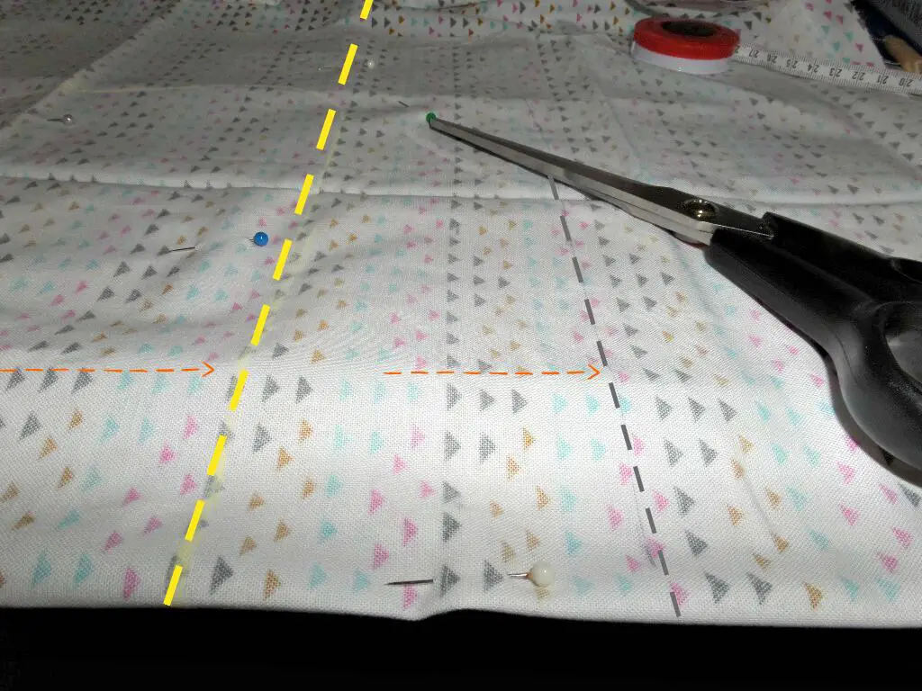 Now that you have your cut out piece, unpin and unfold the whole thing. The side without marks will need them added – measure 3″ in from the edge and mark.